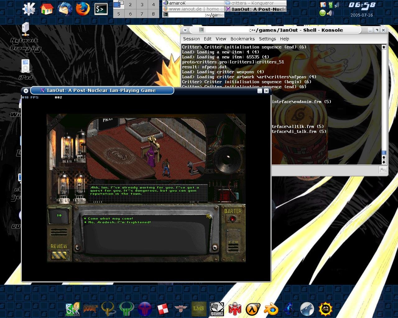 IanOut is an open source engine that tries to replace the old Fallout 2 by creating the abilitiy to run Fallout-like games under linux and having superior modding support. The engine was created by SztupY and started as a fun project to create a Fallout parody. After 4 Beta releases the development is kind of stuck at the moment and we're searching for a new coders that help us to revive the project and port it to Linux. If you're interested: mail a short description of your ideas and perceptions to <a href="mailto:mvBarracuda@web.de">mvBarracuda@web.de</a> or add me in your icq list -> uin:98600423.