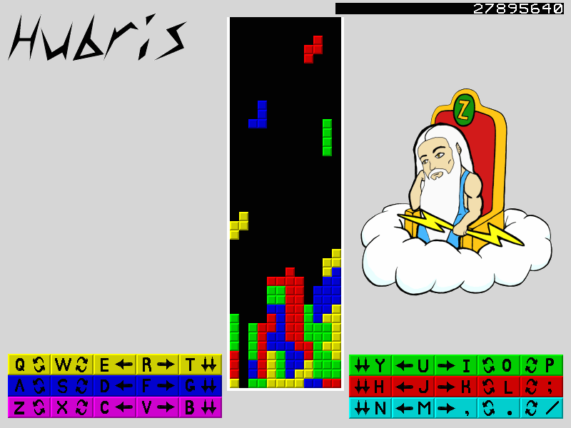 Hubris is a puzzle game in which the player arranges multiple falling blocks into sacrifical lines to please the gods, while avoiding building too close to the heavens lest his hubris arouse their wrath. |