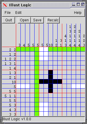 | Illust Logic | Germano Leichsenring | www | Download source | www | Download rpm | 1.0.0 | A puzzle game, popular in Japan | This is Illust logic, known also as Pikros and Paint by Numbers. If you like it, you will love this Unix version (hopefully:) It is stable and playable; only needs some more customization. <p> The objective of Paint by Numbers puzzle is to mark each cell of the canvas to black or white, and complete the picture. Numbers of each row and column show the rules to determine cells in the corresponding row or column. | mia | free | ![]() |