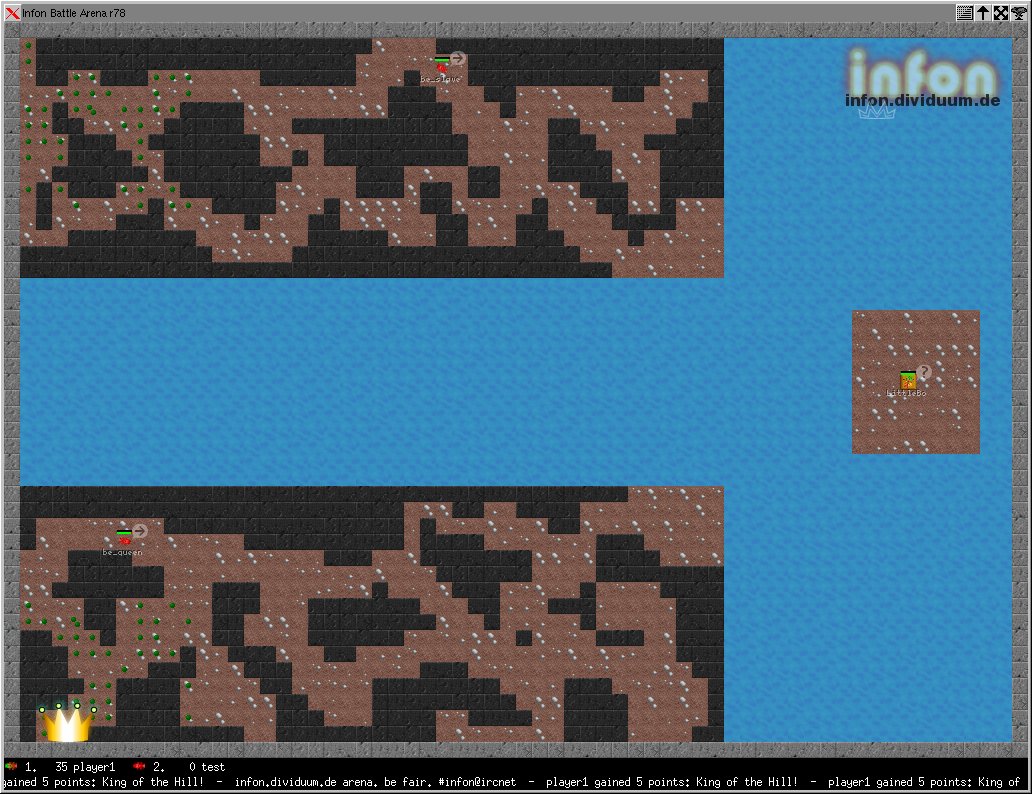 | Infon Battle Arena | Florian Wesch | www | 216 | A Multiplayer Realtime Programming Game. | <p>A multiplayer networked realtime programming game featuring little creatures fighting for food. You upload your Creature Code (written in Lua) to a game server using a telnet-like Interface. The gameserver then runs your code. The graphical client can be used to watch running games or replay recorded games. | simulation | free | ![]() |