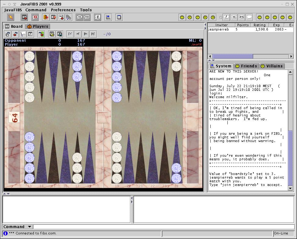 JavaFIBS is a graphical interface to play on FIBS (First Internet Backgammon Server) from a multitude of different platforms such as Windows, MacOS, Linux, Solaris, AIX, and OS/2. JavaFIBS comes in a few different flavours; from a simple applet which you can use directly from your web browser to an advanced version which you have to install on your computer. <p>