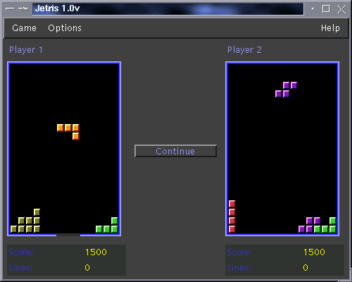 <blockquote>Jetris is a networked battle Tetris game for two players. This package comes with a server as well so you can wait for players to join instead of directly connecting to them in a peer to peer fashion.<blockquote>