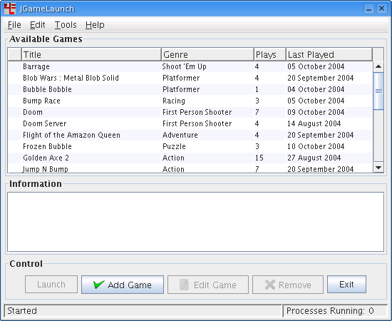 JGameLaunch is a game launcher written in Java. The idea is to provide a simple GUI for which a user can add games that are usually run from the command line. It allows for parameters to be specified, keeps an audit of the game's usage and also allows for a game to be run "in the background", useful for servers. |