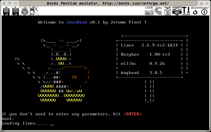 JnuxBand is a Linux bootdisk that contains everything you need to play Angband on a PC. Use it when you cannot install it, but can boot off of a floppy.