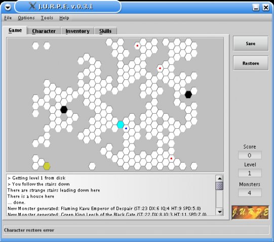 <p>JURPE (Java Universal Role Playing Engine) is a Java API to support the writing of new computer RPG games based on a skill based, three dice RPG system. It comes with a full featured game demo of a medieval warrior crawling into a monster filled dungeon. |