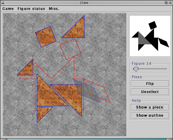 jTans is a Java version of Tangram, an ancient Chinese puzzle. The object is to put 7 geometric shapes together to form a given outline. All of the pieces must be used and are laid next to one another. It can be run as a Java 2 applet, a standalone application, or a Web Start application. |