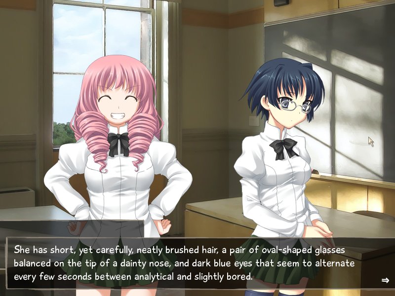 <p>The story is told through the perspective of the main character, using a first person narrative. The game uses a traditional text and sprite-based visual novel model with an ADV text box.</p> |