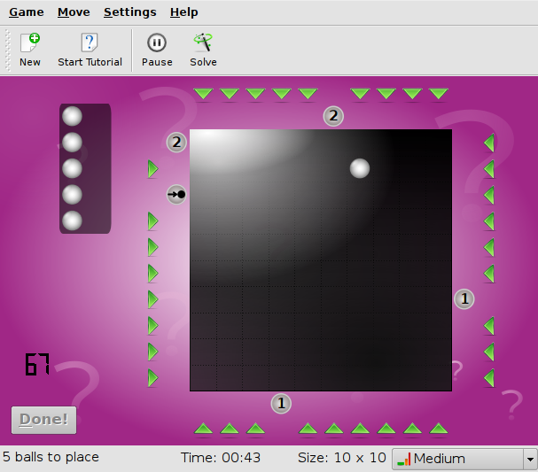 <p>KBlackbox is a game of logic, played on a grid of boxes where the computer has hidden several balls. The player has the task of finding out where the balls are placed by placing laser beams on the sides of the box, and observing how they are deflected.