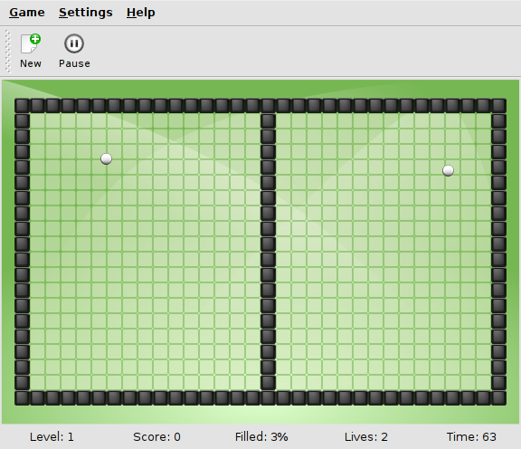 <p>KBounce is a single player arcade game with the elements of puzzle. It is played on a field surrounded by walls, with two or more balls that move about the field bouncing off of walls. The player can build new walls, decreasing the size of active field. |