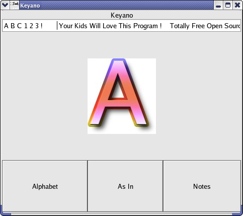 Keyano is a graphical front end for popular Unix applications such as play, aplay, festival, and fortune. It has the ability to turn your PC into a audio/visual sampler that works similar to samplers now in use by DJs. It also includes vocal dictionary and text reader capabilities, as well as a spelling Tutorial and an early version of a chatter bot (in alphabet mode you can: type "A B C" and it says them out loud while it shows letters on screen). |