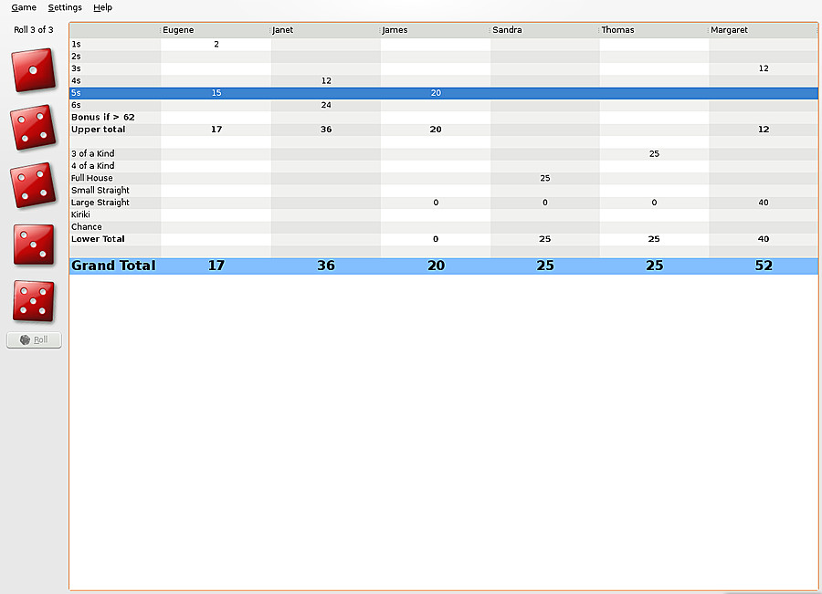 <p>Kiriki is an addictive and fun dice game for KDE, designed to be played by as many as six players. Participants have to collect points by rolling five dice for up to three times per single turn.