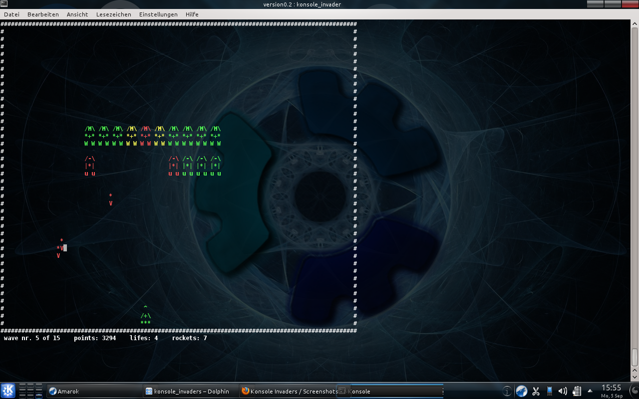 <p>The target of the game is to kill all ships that arrive at the top of the screen. You can shoot, but you have to avoid hits of the enemies shoots. The game is configurable. You can change the size of the field and the number of enemies. |