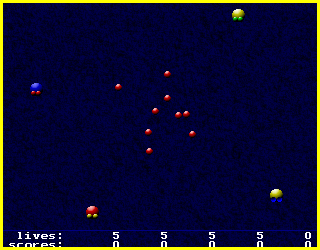 An action game for Linux console (320x200 or 640x480) or X. You're a yellow beach ball with eyes, and your mission is to bounce the little red balls off the edge of the screen while trying not to get bounced off yourself. The enemy balls seem deviously intelligent as they team up to bounce you off the board. Version 1.2 adds client/server network support; play it head to head on a few networked Linux boxes! |