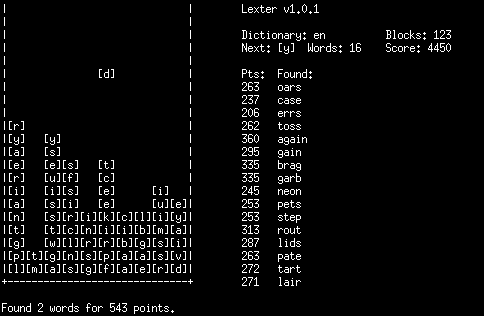 Lexter is a real-time word puzzle for text terminals. Arrange the falling letters into words to score points. It has support for multiple languages and dictionaries. The package contains English and French dictionaries, but needs a French gettext translation for the in game text. |
