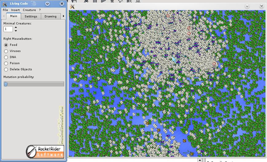 In Living code you have the opportunity to play with the creatures like you want. You can give them food, infect them with viruses, change the DNA, change the look, or just delete them.