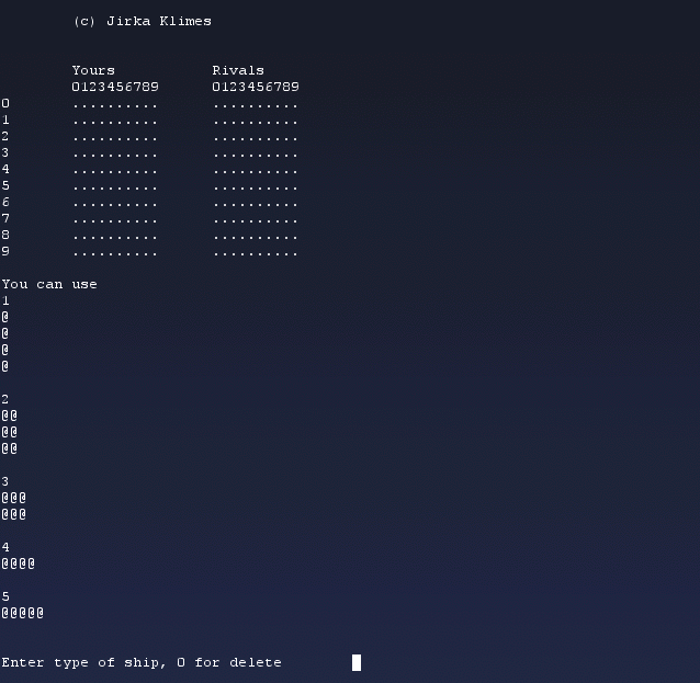 Simple game for two players played by small children in basic schools. Both players have a battle-field in which they place their ships. Your task is to scupper the opponent's ships. |