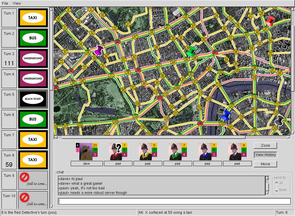 London Law is an online multiplayer adaptation of the classic Scotland Yard board game. One player controls the movements of the criminal Mr. X as he tries to evade Scotland Yard, while another one to five players control five detectives trying to track him down. London Law features an attractive map overlaid on high-resolution satellite imagery. |