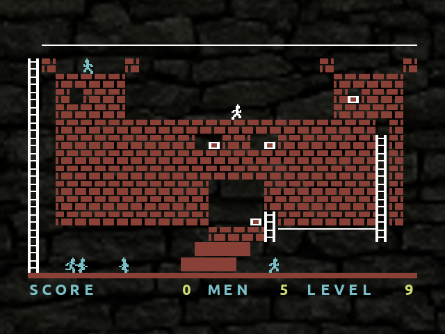 <p>The player controls a stick figure who must collect all the gold in a level while avoiding guards who try to catch the player. After collecting all the gold, the player must travel to the top of the screen to reach the next level. |