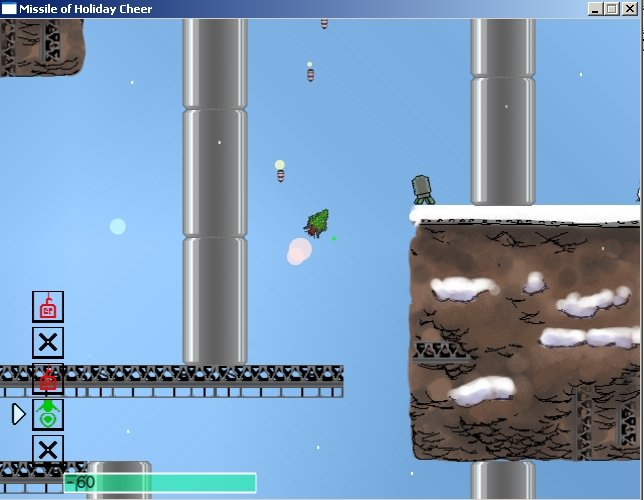 <p>Missile of Holiday Cheer is a game that revolves around piloting missiles bearing presents from elves workshops up to Santas low-orbiting mothership.<br><br>