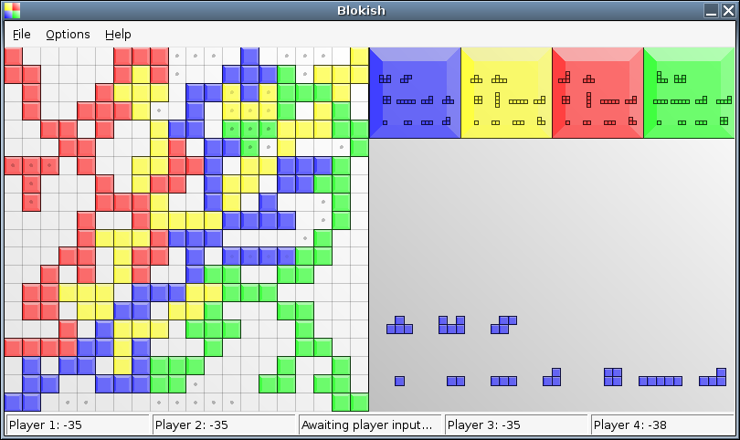 Clone of the strategy board game 'Blokus'. Four players must place as many of their 21 pieces on the board as possible while preventing others from doing the same.