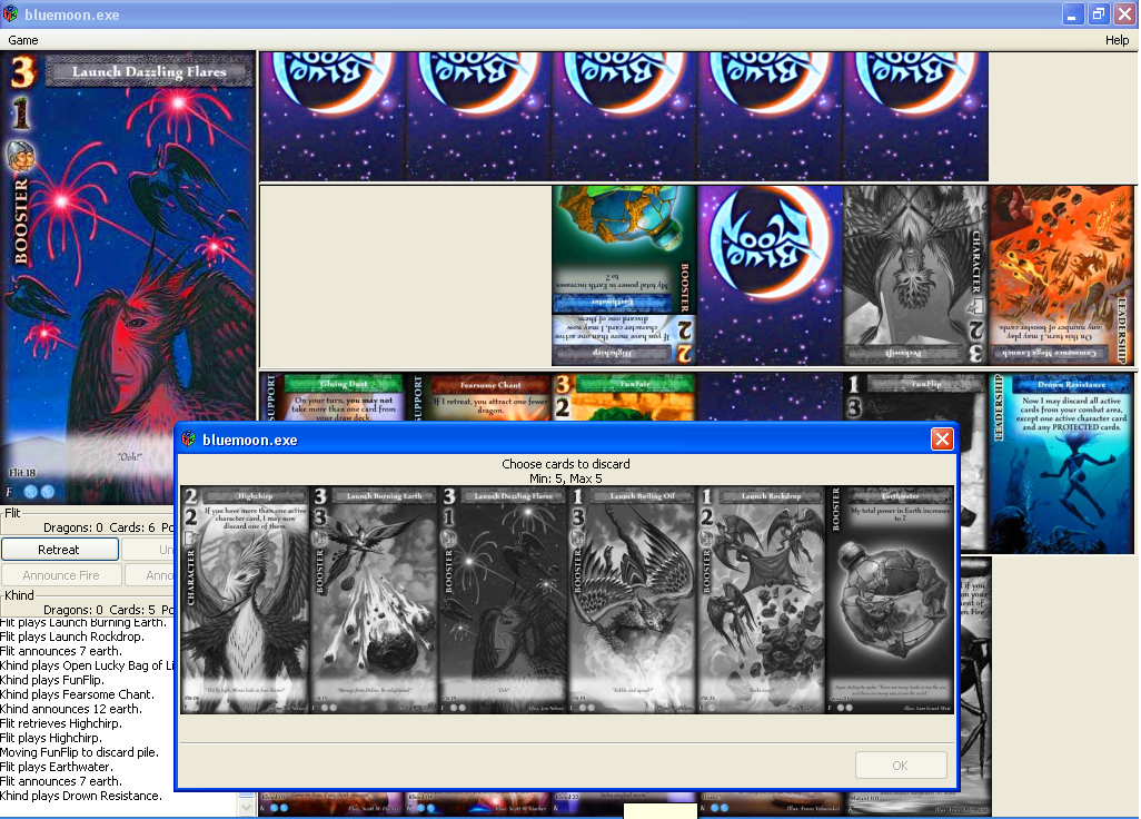<p>Blue Moon is a 2-player card game published in 2004, inspired by collectible card games although lacking the deck-building aspect. This program provides a neural-net-based computer opponent.