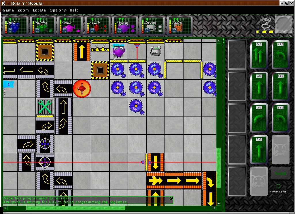 Bots'n'Scouts is inspired by the Wizards of the Coast game "RoboRally". You are assigned a robot in a factory, which you program with 5 moves each round. The robot may not complete the moves exactly as you intended; it may be pushed, moved by conveyor belts, or even destroyed. Your task is to make the robot touch all the flags in the factory, in order, before any other robot does.