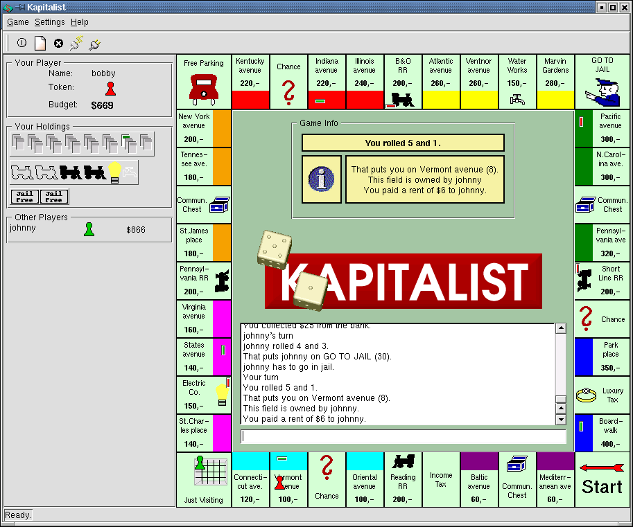 Kapitalist is a Monopoly(R)-like board game for 2-8 players. Walk around the board, buy properties, receive rent from your competitors, try to get monopolies to build houses and hotels on them and increase your wealth.