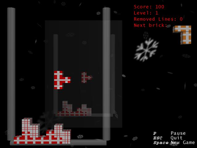 Christmas 2002 is an OpenGL Tetris clone that features everything a good Tetris game has to have. As the name already imposes, the game has Christmas as main theme: snowflakes are falling in the background, nice Christmas music is playing and the blocks are Christmas gift boxes. Beside this Christmas atmosphere, the game has a highscore list and a options menu that lets the user choose how the game looks like. To satisfy every Tetris fan, the game can either be played in windowed or fullscreen mode.