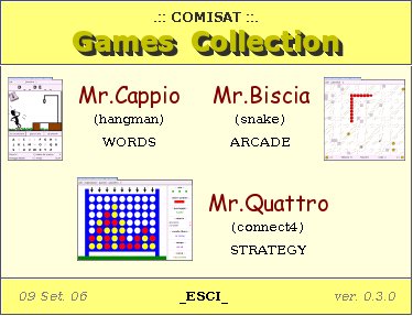 <p>comisat Games Collection is an all-in-one free collection of games written in gambas. Actually, there's five games included: Mr.Cappio (hangman), Mr.Quattro (connect 4), Mr.Biscia (snake), Mr.Mind (master mind) and Mr.Tetris (remake of Atari Tetris 1988). Many others in future versions... |