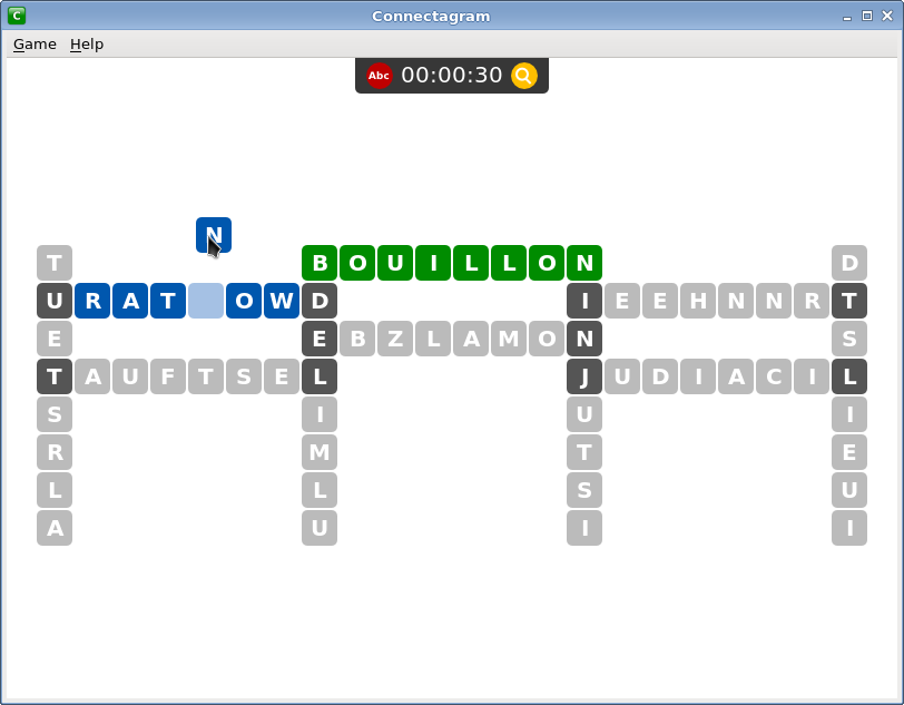 <p>The board of Connectagram consists of several scrambled words that are joined together. You can choose the length of the words, the amount of words, and the pattern that the words are arranged in. The game provides a hint option for times when you are stuck, and features an online word lookup that fetches the definitions of each word from www.dict.org. Your current progress is automatically saved.