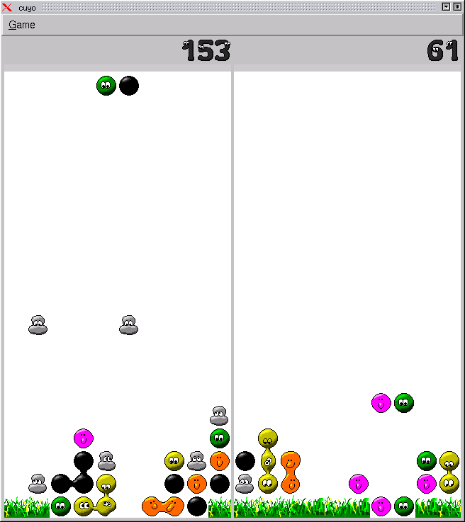 Cuyo is a Tetris-style puzzle game for up to two players. The player controls falling blocks of various types which change with each level. For example, in the first level, the player has to connect differently colored cartoon faces to each other. When enough blocks of the same type are connected, they explode. Usually the level goal is to destroy a certain number of special blocks at the bottom of the screen; these special blocks explode when blocks adjacent to them explode (in some levels, only when this is accomplished through a chain reaction).