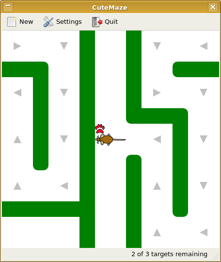 <p>A simple, top-down game in which mazes are randomly generated using one of a choice of several different algorithms. You move the character through the maze while hunting for targets (cheese, by default)--the game is won once all of these targets have been picked up.