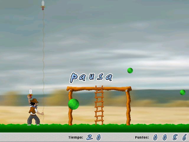 <p>A game similar to 'Super Pang'. You are attacked by little green balls which are bouncing around and which you have to kill with your knife. Your knife however is limited to being thrown upwards, thus you have to get under the balls to kill them. Even worse, if you 'kill' a large ball, it doesn't just vanish, but breaks apart into two smaller balls. Levels consist of little platforms connected by ladders, so you can go up and down or find cover if needed.</p> |