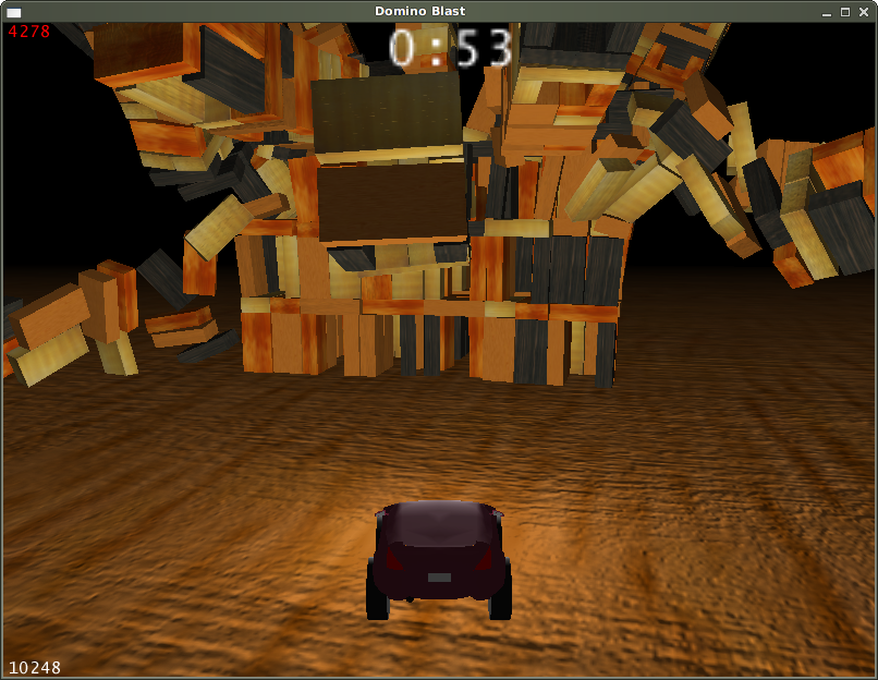 Domino Blast is a hybrid driving and destruction game with a children's toys theme. Its environments consist of buildings constructed from domino tiles and a player-controllable toy car. The objective of the game is to wreak as much havoc as possible, within a time limit.