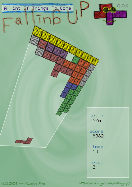 <p>The game is... tetris. You have the same old blocks, and they fall down. You use left and right to move blocks left and right, up to rotate, down to move down a line, and spacebar to drop. There's a 'next' item (optional), sound (optional), and... stuff like that. |