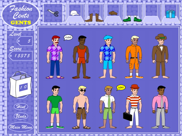 <p>In this sequel to the original fashion puzzle game, fans finally get to dress-up some guys! As always, you are given a wide assortment of hats, tops, bottoms, and shoes in a variety of styles and colours, which you must combine into outfits that are colour-coordinated. Add accessories like glasses, jackets, and briefcases to score bonus points. You can also add new hair pieces like moustaches and beards to score even larger bonuses! And try to cash in with the special 10X bonus that appears occasionally on random dolls - if you can create an outfit on that doll before the 10X bonus disappears, you can really boost your score! |